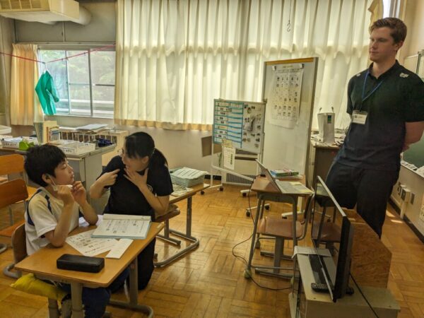 小学部では、英語で自己紹介をし合ったり、アメリカの小学校についてのお話を聞いたりしました。ゲームでは、アルファベットのカードを順番通りに並べたり、神経衰弱をしたりして、楽しく活動ができました。