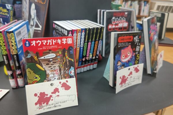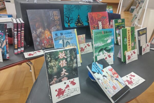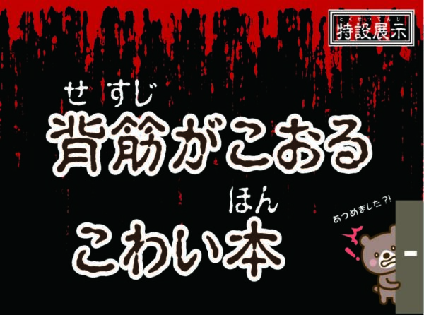 図書室に入ってすぐの特設展示では“背筋がこおるこわい本”特集をしています。