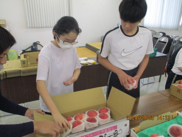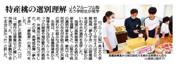 山梨県立ろう学校 > 活動の様子 > 中学部 JAフルーツ山梨との地域交流 2024年7月26日カテゴリー: 活動の様子 中学部 JAフルーツ山梨との地域交流 7月3日(水) JAフルーツ山梨との地域交流の2回目として、中学部1年生4名が、かのいわ中央共選所に行きました。 共選所の見学の後、桃の選別・箱詰め・箱作りを体験させていただきました。 生徒たちは、担当の方に指導を受けながら、それぞれの作業に真剣な眼差しで取り組んでいました。 その後、夢みずきと夢桃香という2種類の桃の試食をさせていただきました。とても美味しくいただきました。 質疑応答の時間には、桃や共選所について質問させていただき、地域産業への理解を深めることができました。 なお、今回の交流については、7月6日付の全国紙「日本農業新聞」に掲載されました。