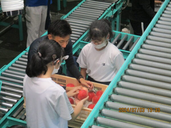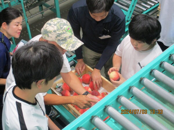 共選所の見学の後、桃の選別・箱詰め・箱作りを体験させていただきました。