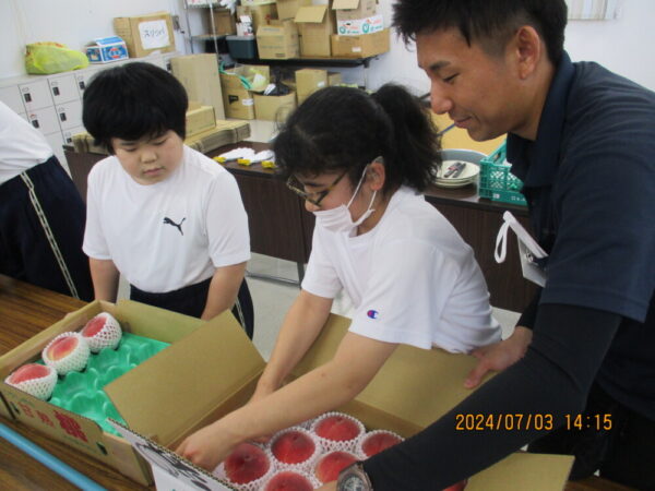 JAフルーツ山梨との地域交流の2回目として、中学部1年生4名が、かのいわ中央共選所に行きました。