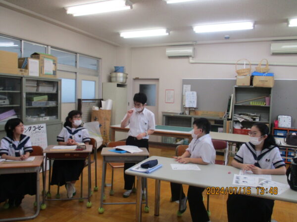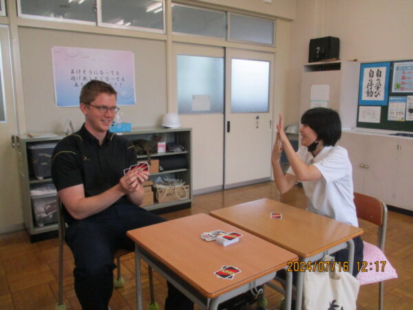 中学部では、生徒たちと先生方で「夏休みにしたいこと」を英語で発表し合い、質疑応答もできるだけ英語で行いました。クーパー先生からはアメリカのおもしろいかき氷の名前を聞いて、生徒たちは皆驚いていました。高等部でも、「夏休みにしたいこと」を英語で発表し合い、その後、英語でUNOをして大いに盛り上がりました。