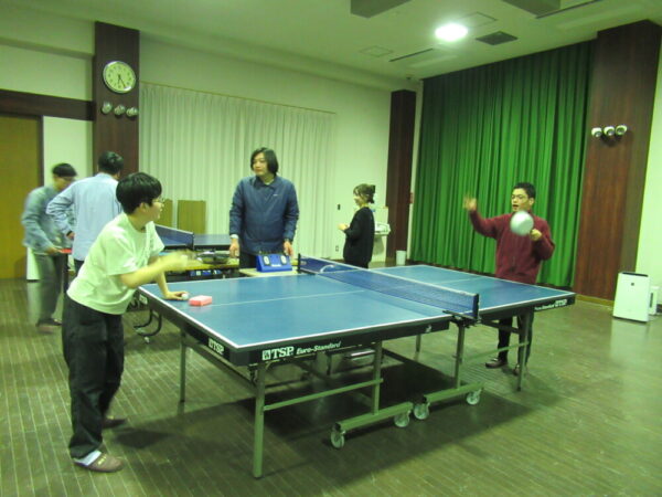 おもしろ卓球は、ラケットだけでなく様々な道具を使うルールで、さらに使える道具は当日まで秘密。係が準備したフライパンや鍋、スポンジ、辞典などを使い、ダブルスとシングルスで対戦しました。思うように球が打ち返せなかったり、変な動きになったりする姿に笑いが絶えず大盛り上がりでした。