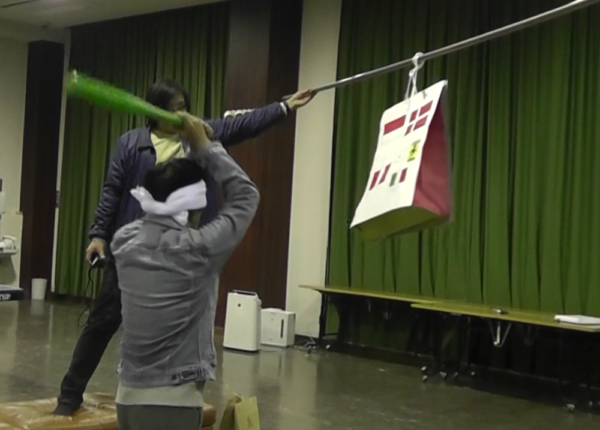 ピニャータは、ペルー出身の指導員にアドバイスをもらいながら、どんな形でつくるのか、材料は何を使うか、中身は何を入れるのかなどを係でアイデアを出し合い、協力して作成しました。遊び方は、順番に目隠しをしてグルグルバットをしたあと2回叩くという寄宿舎のオリジナルルール。全員が2周する間に何度かピニャータに当たり、徐々に割れていきました。中身がすべて出ると、一斉にお菓子を拾って盛り上がりました。