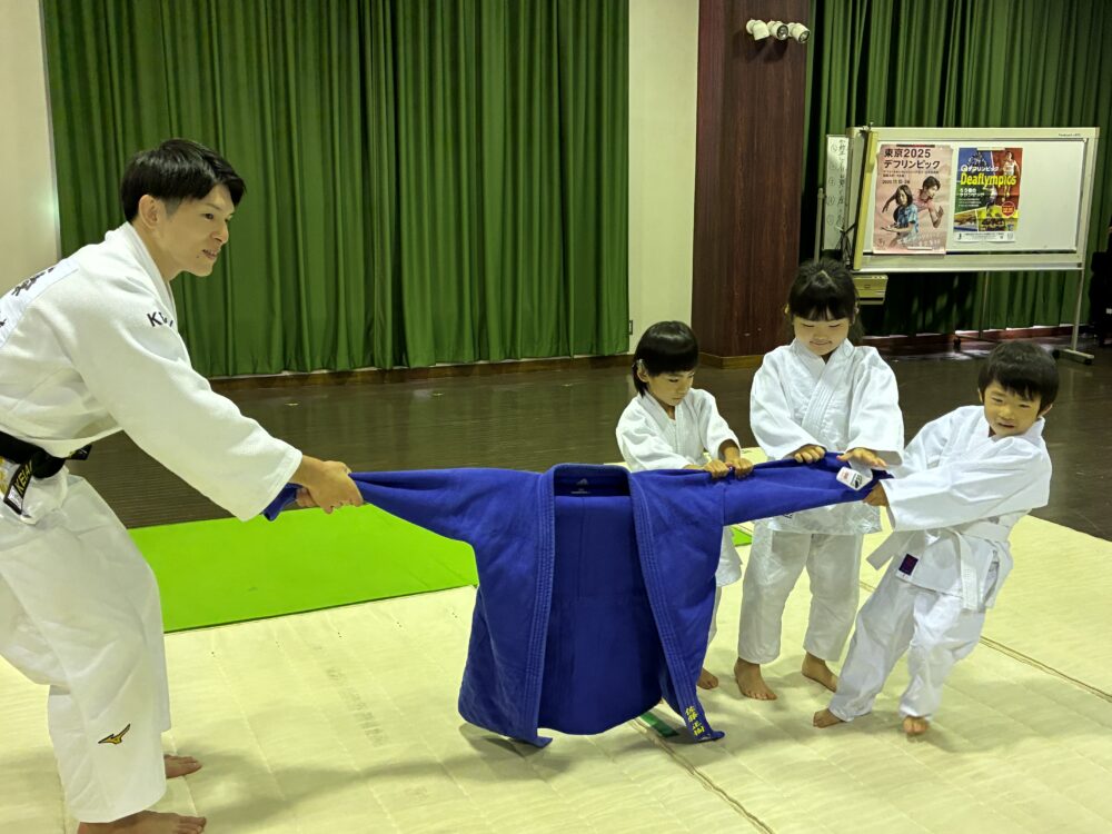 9月16日にデフリンピック学習会を行い、デフ柔道の佐藤正樹選手と一緒に柔道をしました。初めて柔道に触れる子どもたちでしたが、とても楽しそうでした。最後には佐藤選手と試合をし、投げ技を成功させるとみんな大喜びでした。