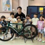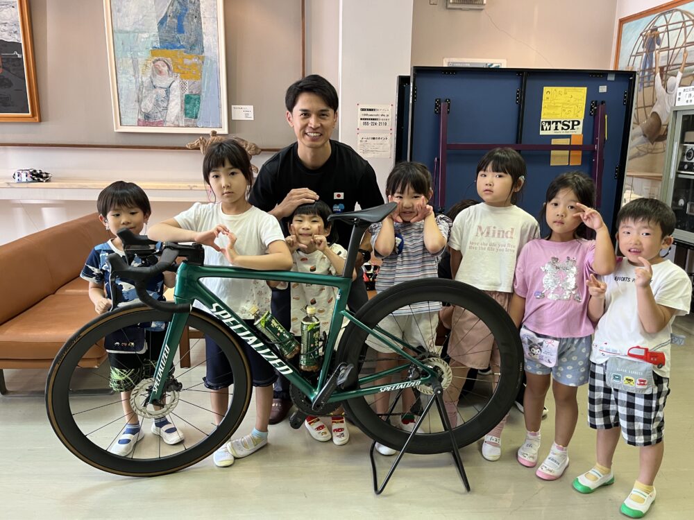 24日にはデフ自転車の藤本六三志選手が来校しました。幼稚部は壮行会に参加しました。藤本選手の自転車のタイヤを見て、「細い!!」と驚きの声が聞こえました。