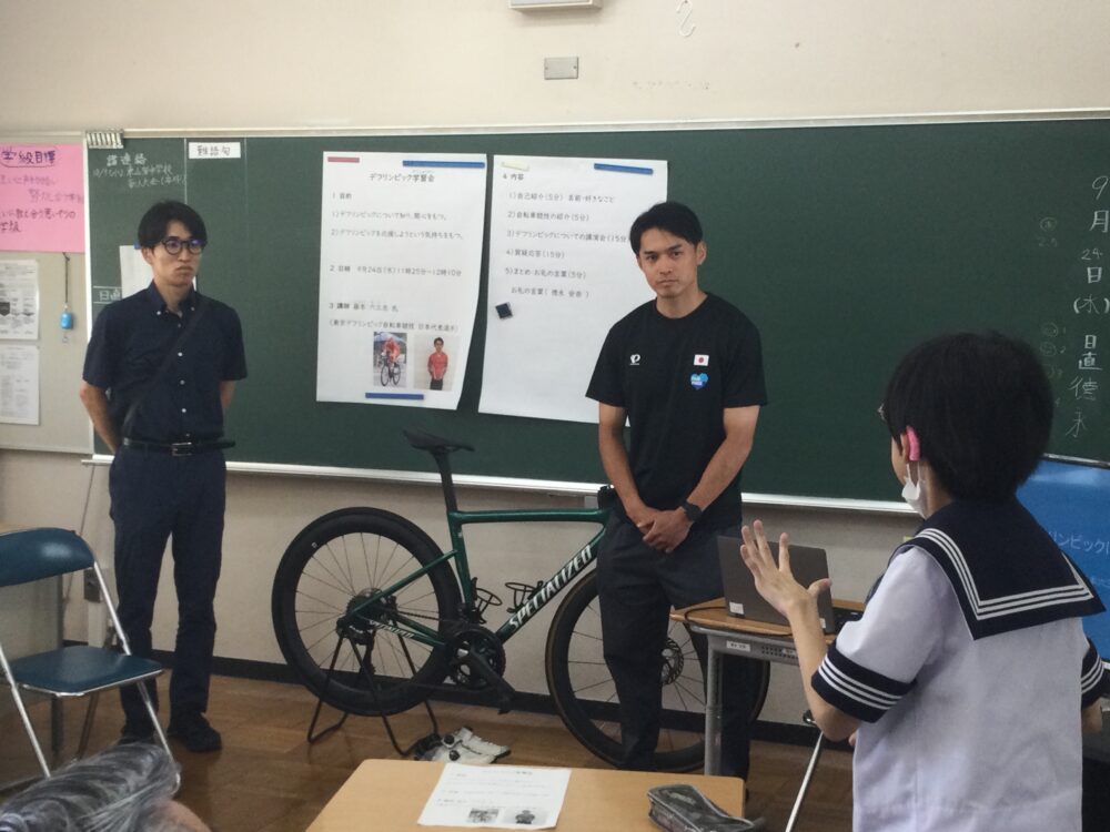 山梨県立ろう学校 > 活動の様子 > デフリンピックを応援 2025年10月2日カテゴリー: 活動の様子 デフリンピックを応援 9月24日に東京2025デフリンピックの 自転車競技に出場予定の藤本選手が来校されました。 中学部の授業にお招きし、 自転車の魅力や、取り組む姿勢についてお話していただきました。 実際の自転車にも触れさせていただき、生徒にとって よい経験となりました。 午後は全校で壮行会を開き、藤本選手に エールを送りました。 *東京2025デフリンピックは 11月15日から26日に開催されます。 選手のみなさんの活躍を応援しています!