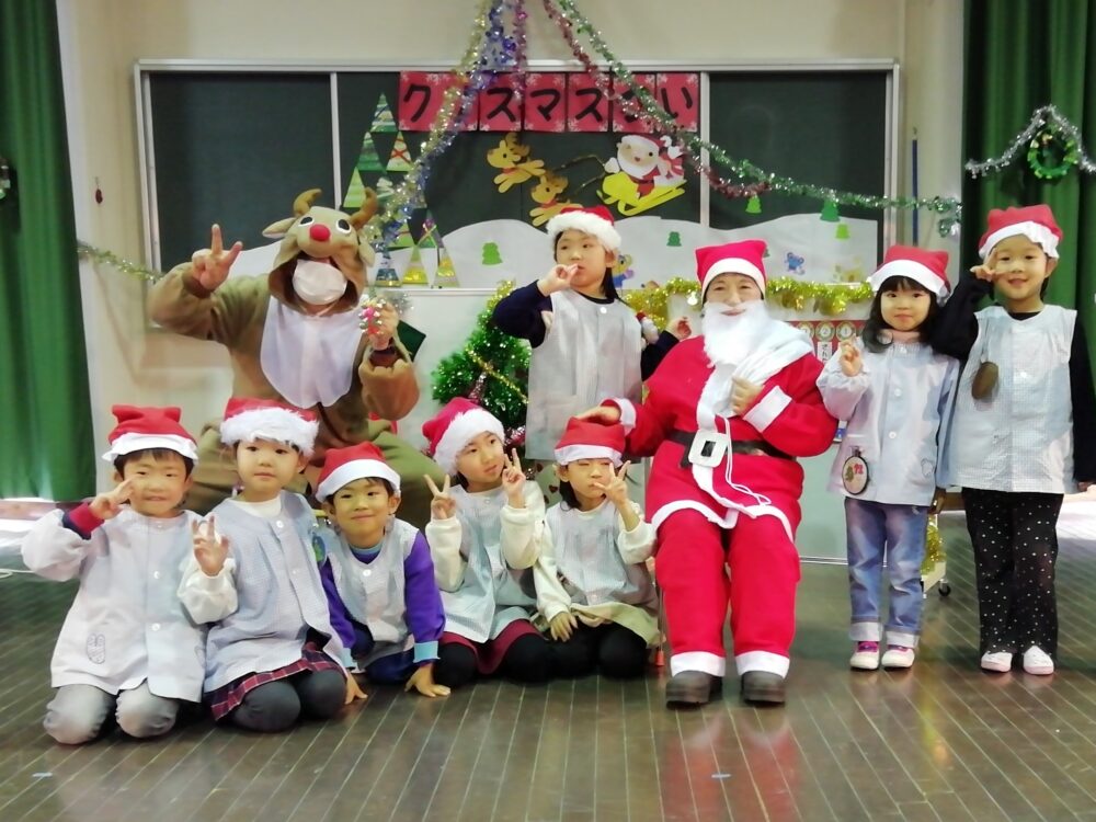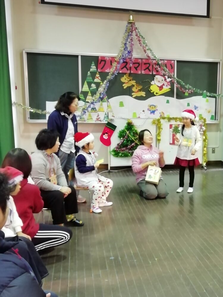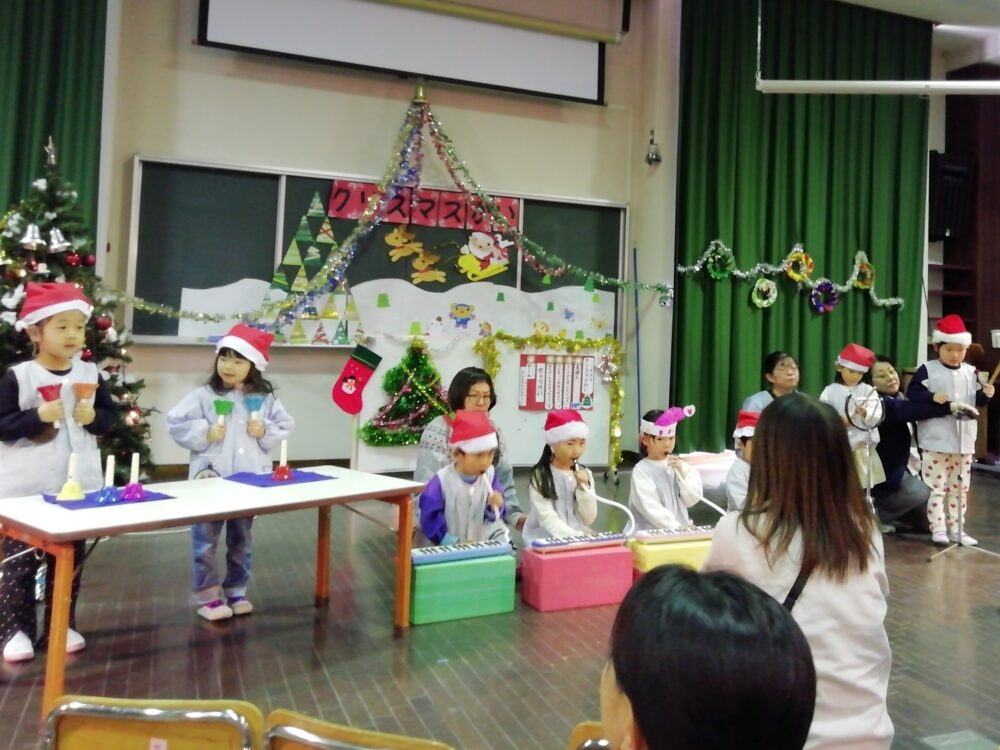 17日にクリスマス会が行われました。教師による絵本の読み聞かせや、子どもたちの歌と合奏の発表、ゲームなど、盛りだくさんの内容でした。