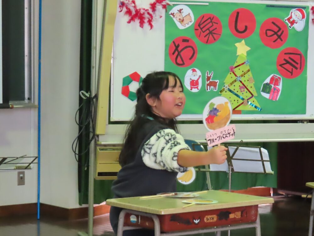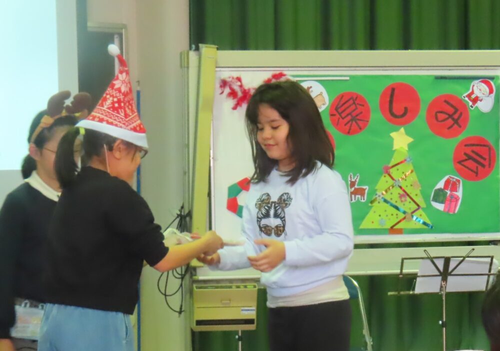 小学部では児童会主催のお楽しみ会が行われました。5・6年生の児童会役員を中心に、準備を頑張ってくれました。みんなでいす取りゲームやフルーツバスケットをして、大盛り上がり。最後は、サンタクロースとトナカイに変装した児童会役員からプレゼントも。みんなで一緒に、にぎやかで楽しい時間を過ごすことができました。