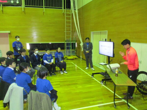 本校にてデフリンピック報告会を実施し、卓球の亀澤史憲選手、柔道の佐藤正樹選手、自転車競技の藤本六三志選手の3名のメダリストをお迎えしました。全校幼児児童生徒で選手の活躍をお祝いした後、学部ごとに交流会を行い、選手とスポーツを楽しんだり、競技や練習について直接お話を伺ったりすることができました。