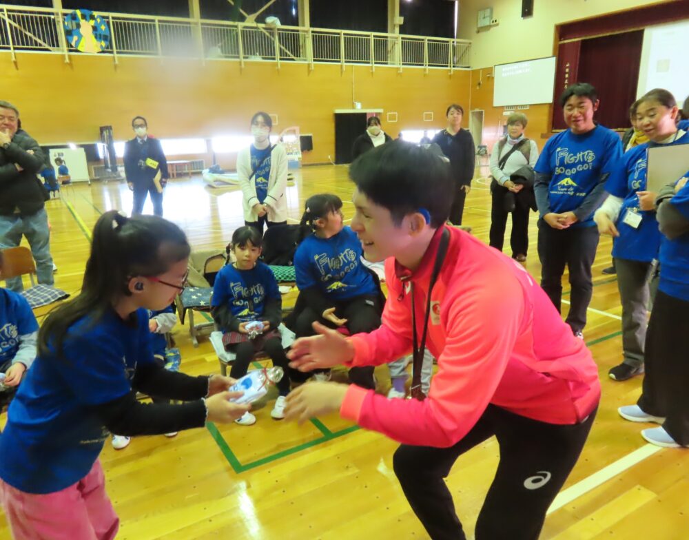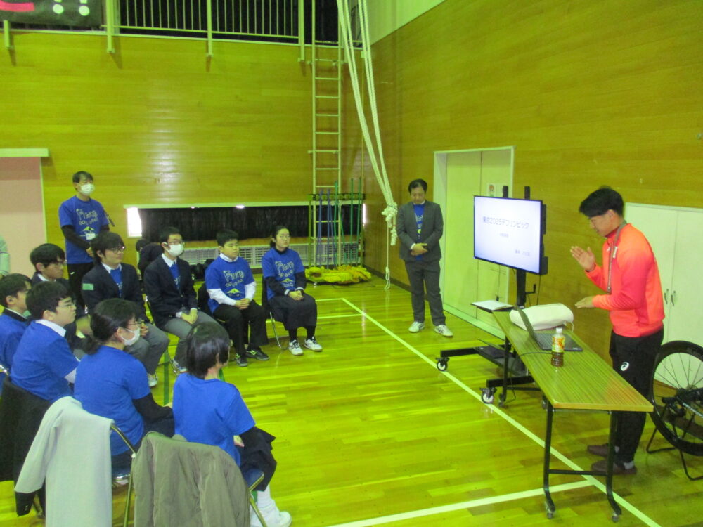 山梨県立ろう学校 > 活動の様子 > 東京デフリンピック報告会を実施しました。 2026年1月27日カテゴリー: 活動の様子 東京デフリンピック報告会を実施しました。 本校にてデフリンピック報告会を実施し、卓球の亀澤史憲選手、柔道の佐藤正樹選手、自転車競技の藤本六三志選手の3名のメダリストをお迎えしました。全校幼児児童生徒で選手の活躍をお祝いした後、学部ごとに交流会を行い、選手とスポーツを楽しんだり、競技や練習について直接お話を伺ったりすることができました。 2年間にわたっての本校のデフリンピック教育にご協力いただいた皆様に、心より感謝申し上げます。 山梨県立ろう学校は、3選手の今後の活動を引き続き応援していきます。 選手の皆様、今後のご活躍を願っています。