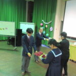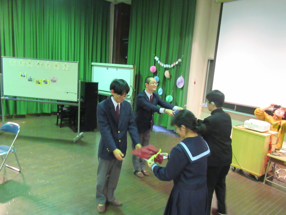 卒業生が喜びそうな記念品を舎生たちで考え記念品を贈呈しました。贈呈する際には、一人ひとりが、卒業生に感謝の思いを伝えました。担当の先生からもメッセージとともに、卒業後に役立つプレゼントが手渡されました。