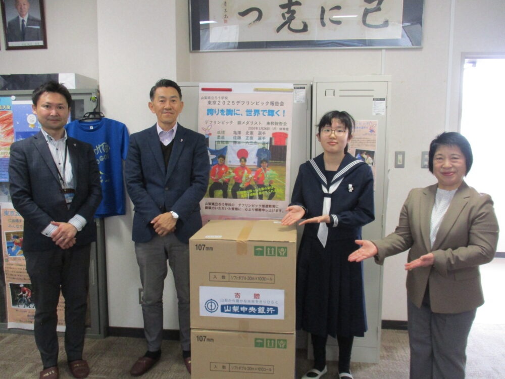 山梨県立ろう学校 > お知らせ > 山梨中央銀行様からの温かいご寄贈(トイレットペーパー)に感謝します 2026年3月18日カテゴリー: お知らせ 山梨中央銀行様からの温かいご寄贈(トイレットペーパー)に感謝します 本日、山梨中央銀行日下部支店の支店長さま・副支店長さまが来校され、本校にトイレットペーパー2箱をご寄贈いただきました。児童生徒の学校生活の充実に大いに役立ててまいります。温かいご厚意に、心より感謝申し上げます。